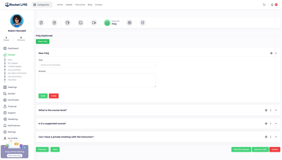 Description: The class description that will be displayed on the class page includes all of the information about the course educational material, instructor, and other related information that will motivate viewers to enroll in the course. We suggest writing at least 300 words for this page because it is one of the most important SEO requirements.