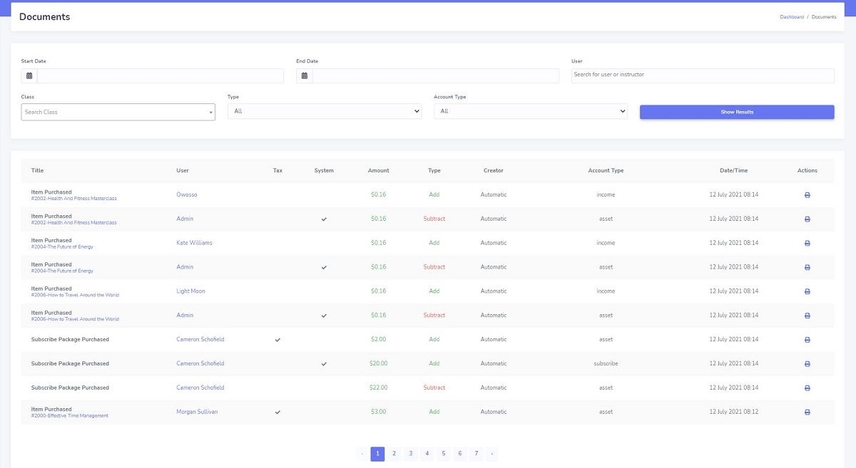 All of the automatic and manual balances will be listed in the balances list and you can filter items to analyze your business financial parameters. There are two balance types in the system: Automatic: All of the balances that are related to the processes like purchase, sell, commissions, tax, meeting reservation, account charge, offline payments, payout, etc will be done automatically. Manual: When the staff or admin wants to manage balances manually for specific reasons like record platform expenses and incomes, salaries management, manage a user balance for reasons like penalties, etc they can use the manual balances feature. Let's review available columns in the financial balances list: Title: Indicates the reason for creating the balance. User: The source user account that they added or deducted to their account. Tax: If a balance included tax value, this column will be checked. Note: You can view the financial process in the following chart. System: When an amount added or subtracted to the system (Platform) account, it will be checked. For example, when a purchase is done, the system commission will be charged to the system account automatically so the related financial balance will be checked as a system transaction. Amount: The amount of the financial document that was added or subtracted from the account. Type: Addition: When an amount is added to an account. Subtraction: When an amount is reduced from an account. Creator: There are two values for this part “Automatic” for balances that are created automatically and the “Username” such as admin, staff accounts, etc that indicates who created the manual balance so you can trace everything to prevent staff cheats. Account type: Each user has two wallets in their account: A: Income wallet that includes user incomes such as the commission of selling courses and meetings. B: Account wallet that includes all of the amounts except for the income.