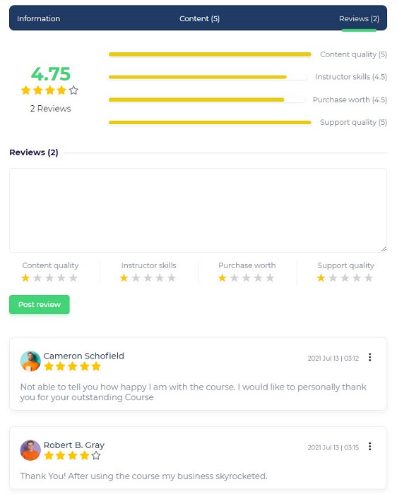 The student should purchase a class or enroll in it for free to be able to write a review and reviews will be published after admin approval.